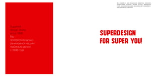 Студия дизайна Superdesign предлагает создание визуальной айдентики для компаний, включая логотипы, фирменный стиль, рекламные материалы и веб-дизайн. С 1998 года она успешно работает с различными клиентами, включая банки, рестораны и производственные компании, предлагая инновационные решения в дизайне. Проекты включают редизайн логотипов, создание иллюстраций и рекламных кампаний, а также разработку уникальных календарей и упаковки продуктов.