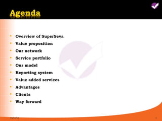 SuperSeva is an Indian company that provides concierge and other services to corporate clients through a network in 17 cities, handling over 30,000 requests per month for its over 1,000,000 registered customers, with the goal of expanding to 27 cities by May 2011 through its various service offerings and technology-enabled request management system.