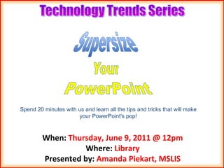 A PowerPoint workshop will be held on June 9th at 12pm in the library presented by Amanda Piekart, where attendees can learn tips and tricks to make their PowerPoint presentations more effective. On July 14th also at 12pm, Amanda Piekart will present a workshop in the library on finding and using popular add-ons for the Firefox browser. Both workshops will last 20 minutes.
