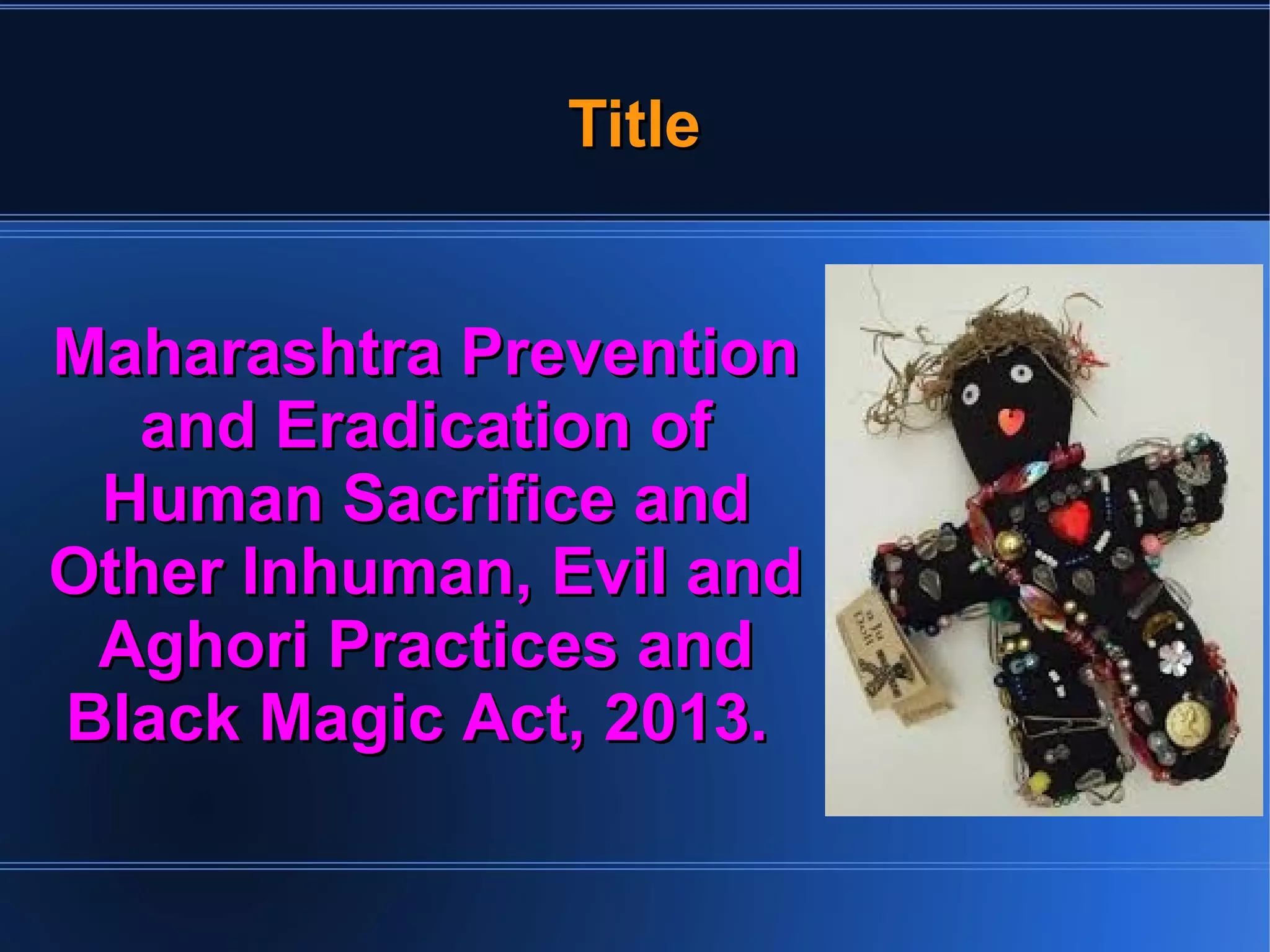 The Maharashtra Prevention of Human Sacrifice and Other Inhuman, Evil and Aghori Practices and Black Magic Act, 2013 aims to create social awareness and combat human sacrifice and other inhuman or evil practices. The Act defines these practices and black magic and prescribes offenses and punishments. It grants jurisdiction to metropolitan and judicial magistrates and allows for the appointment of vigilance officers to assist police in detecting offenses punishable under the Act. The Act also provides for publishing details of convicted individuals. Certain traditional practices are excluded from being considered offenses.