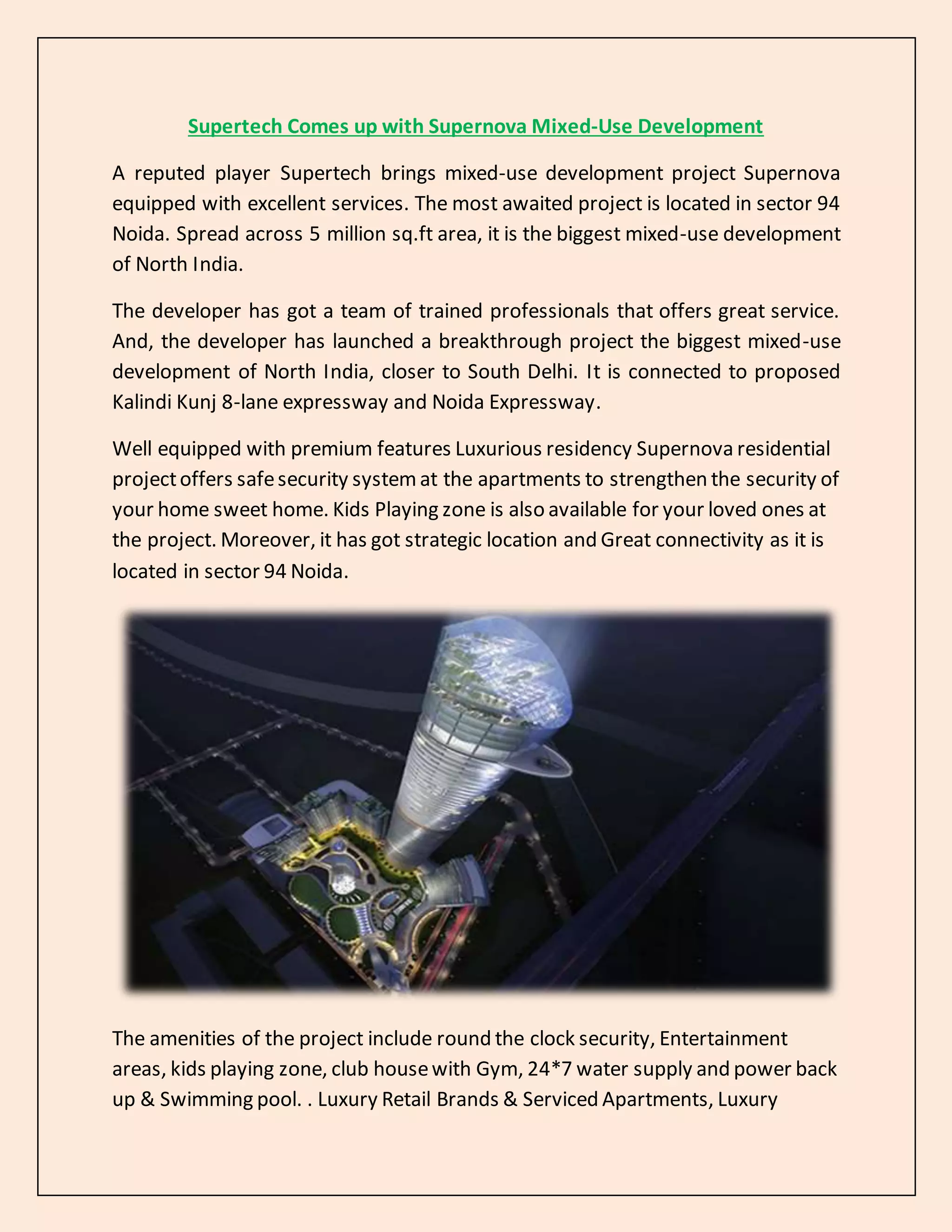 Supertech is developing Supernova, a mixed-use project in Noida sector 94 covering 5 million square feet. It will include luxury residences, retail, serviced apartments, offices, and hotels. As one of the tallest towers in India at 300 meters, it will offer views of the Noida Bird Sanctuary. The development will be well connected to roads and have amenities like security, a clubhouse, gym, pool, and playground. Supertech is an established real estate developer known for quality projects delivered on time.
