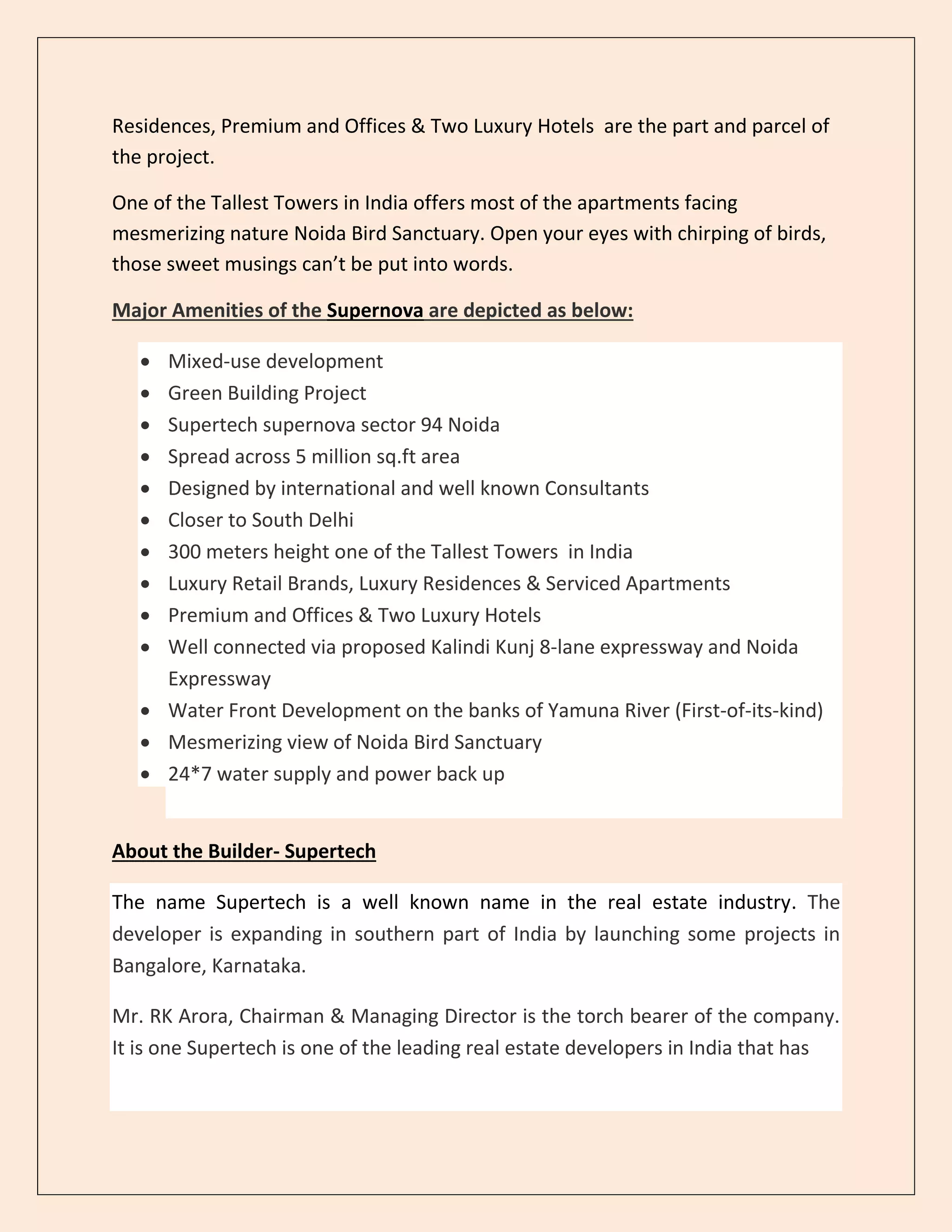 Supertech is developing Supernova, a mixed-use project in Noida sector 94 covering 5 million square feet. It will include luxury residences, retail, serviced apartments, offices, and hotels. Some features include a 300 meter tall tower, views of a bird sanctuary, security, a clubhouse and gym. The developer, Supertech, is a leading real estate company known for quality projects and customer satisfaction.