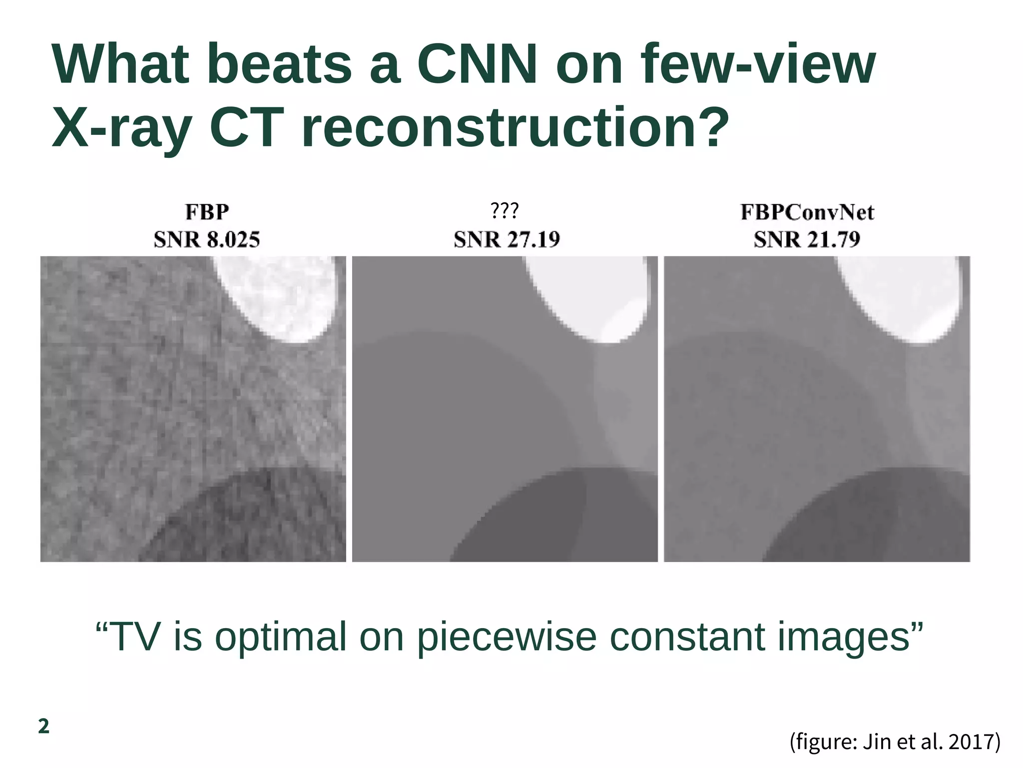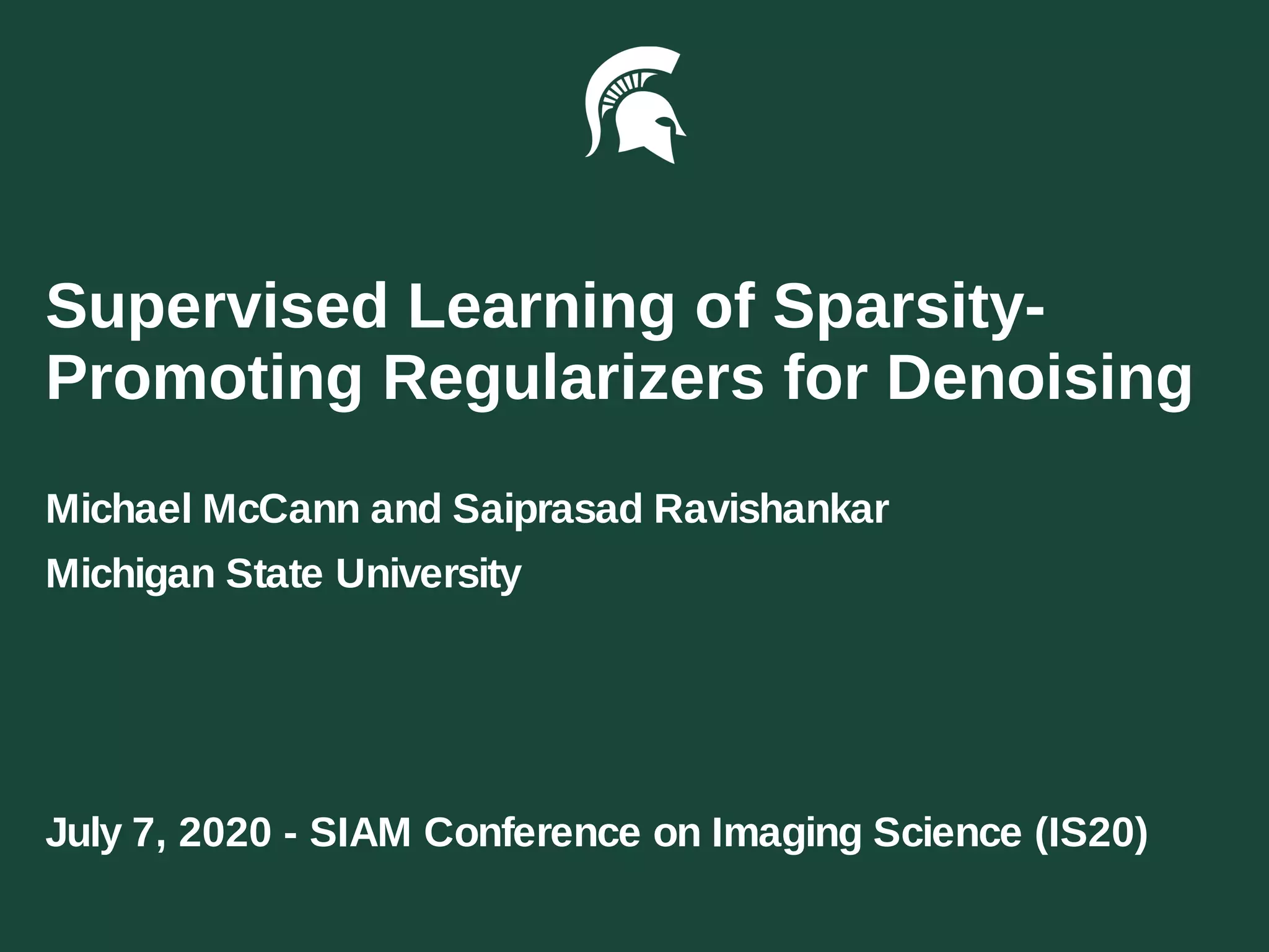 The document discusses the supervised learning of sparsity-promoting regularizers for denoising, comparing various methods such as learned operators with traditional techniques like TV and DCT. It presents a new approach involving gradient descent and provides results from denoising experiments using 64x64 images affected by Gaussian noise. The authors suggest future research directions, including comparisons with CNN-based denoising and extensions to nonuniqueness in reconstruction problems.