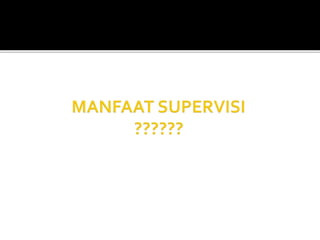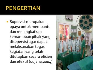 Dokumen ini membahas tentang supervisi sebagai upaya untuk meningkatkan kemampuan pihak yang disupervisi dalam menjalankan tugas secara efisien dan efektif. Teknik pengawasan meliputi pengamatan langsung dan kerjasama dengan berbagai sistem, termasuk preventif dan verifikatif, untuk mengidentifikasi dan menyelesaikan masalah. Tujuan supervisi kinerja mencakup peningkatan kualitas, kepuasan kerja perawat, dan kepuasan pelanggan.