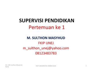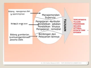 Dokumen ini membahas tentang supervisi pendidikan, termasuk definisi, tujuan, kompetensi supervisor, dan pendekatan yang diterapkan dalam supervisi. Terdapat tiga pendekatan supervisi yaitu direktif, kolaboratif, dan non-direktif, masing-masing dengan karakteristik dan tanggung jawab yang berbeda antara supervisor dan guru. Selain itu, dokumen ini juga menyoroti pentingnya kompetensi kepala sekolah dalam melaksanakan supervisi untuk meningkatkan profesionalisme guru.