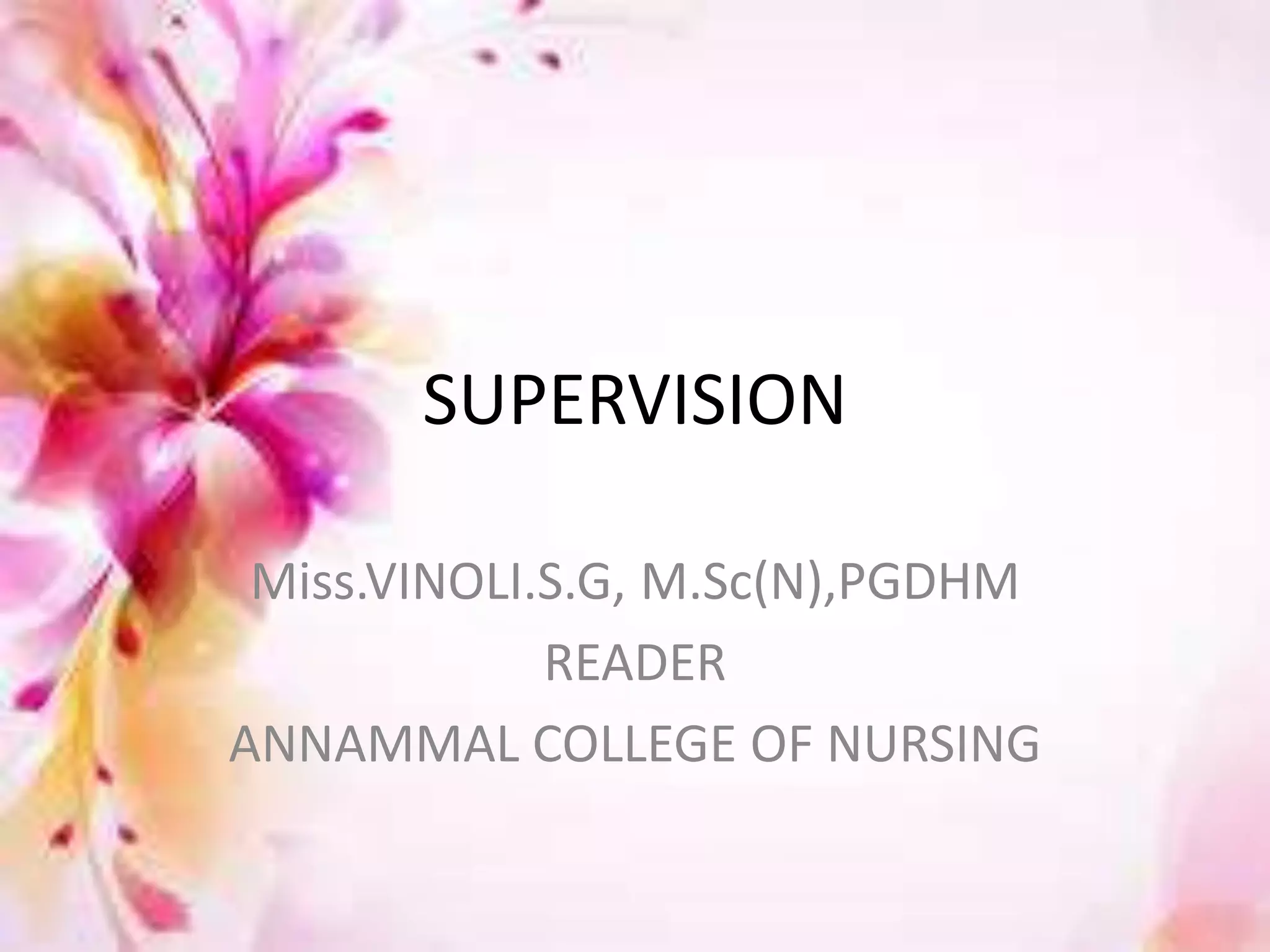 This document discusses supervision in nursing. It defines supervision and lists its objectives as helping subordinates work skillfully, developing their capacity, promoting teamwork, and bridging personal and organizational goals. The principles of supervision include aiming for growth, improving thinking, formulating objectives, and stimulating interest. A supervisor is responsible for quality, production, equipment, employees, training, and morale. Qualities of a good supervisor include being trained, knowledgeable, healthy, and having good listening, leadership, creativity, judgment, and human skills. The effectiveness of supervision depends on human relations skills, leadership, technical/managerial knowledge, and improved upward relations. Problems can include personnel shortages, individual differences, outdated policies, and ill health.