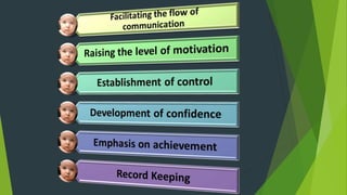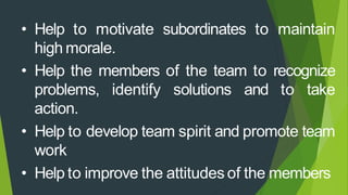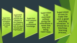 Supervision involves overseeing employees' work through guidance, teaching, and evaluation. It aims to help subordinates perform their tasks better by training, educating, guiding and counseling them. Supervision can be direct through face-to-face interaction or indirect using records and reports. The purposes of supervision include inspecting work, evaluating performance, promoting motivation and teamwork, and bridging gaps between personal and organizational goals. A good supervisor establishes clear performance criteria, provides feedback, encourages participation, respects subordinates, and helps staff grow in their roles.