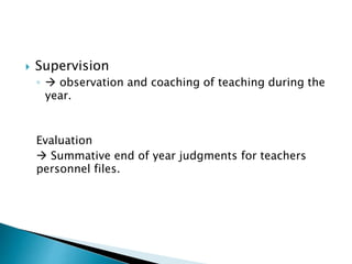 The document outlines the goals of a teacher evaluation system, including accurately assessing teacher quality, retaining and developing top teachers, improving weaker teachers, and dismissing ineffective teachers. It also notes some challenges with evaluation, such as a lack of shared definition of good teaching, principals only seeing a small part of each teacher's work, evaluations being time-consuming and keeping principals out of classrooms, and not measuring student learning.