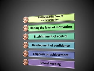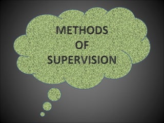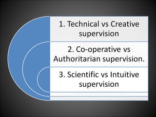 This document discusses supervision in healthcare organizations. It defines supervision as helping workers learn, use their skills effectively, and improve their abilities to do their jobs well and be satisfied. The objectives of supervision include helping staff work skillfully, developing their capacities, guiding them to meet targets, and motivating them. Supervision functions include developing team spirit, improving knowledge and skills, maintaining relationships, and identifying and solving problems. Principles of supervision are that it should not overburden workers, foster independent thinking, encourage participation, and respect staff. Techniques include direct observation, indirect review of records and reports, checklists, rating scales, and nurse reports.