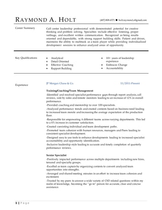 Raymond Holt has over 10 years of experience in leadership, training, and coaching roles in both the military and private sector. He seeks the Supervisor, Telemarketing position at Wyndham Vacation Ownership where he can utilize his strong communication, development, and team building skills. Holt has a proven track record of motivating employees, increasing performance metrics, and managing teams. He is confident that his background mentoring trainees across cultures and developing martial arts instructors and call center specialists positions him as the right fit for this role.