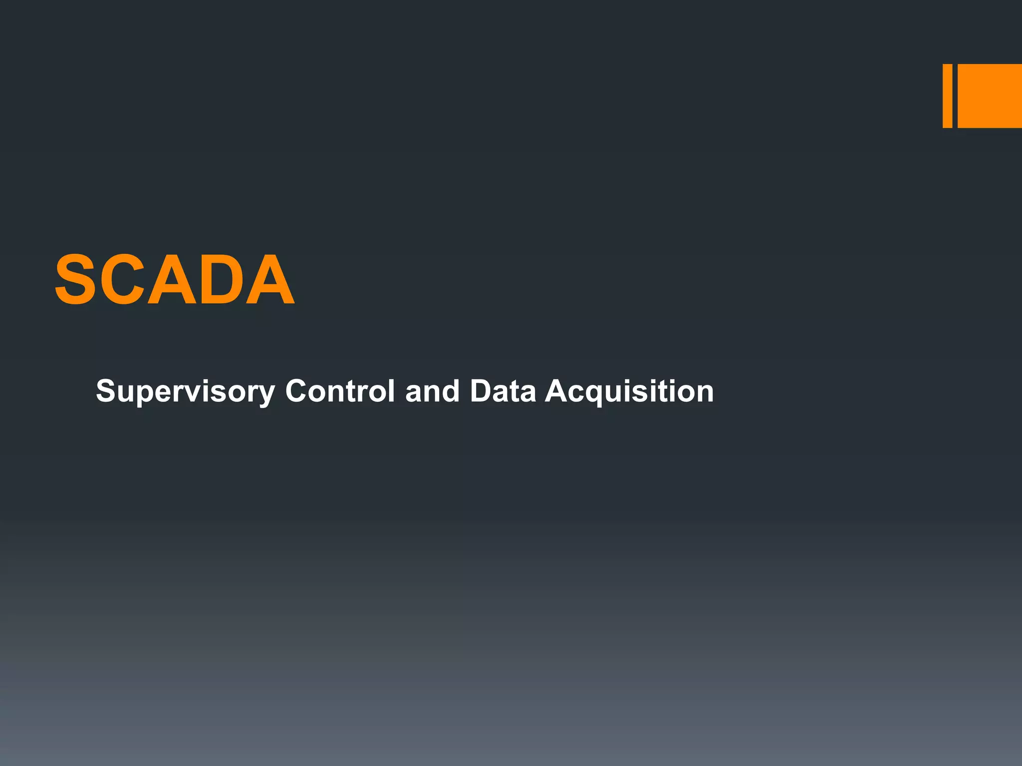This document provides an overview of SCADA (Supervisory Control and Data Acquisition) systems. It defines SCADA as combining telemetry and data acquisition to collect information from remote sites, transfer it back to a central location, analyze the data, and display it for operators. The key benefits of SCADA are remote monitoring and control to reduce costs. Core SCADA components are the master terminal unit, remote terminal units, communication network, and software interface. Typical configurations connect one master station to multiple remote stations or allow direct peer-to-peer connections between all sites.