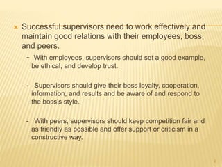 This document discusses the responsibilities and skills of effective supervisors. It outlines that supervisors must work well with employees, management, and peers by setting a good example, providing trust and loyalty, and offering constructive feedback. Supervisory responsibilities include conducting safety meetings and investigations, assisting with job safety analyses, maintaining equipment and work areas, training employees, and supervising task performance. Additional characteristics of successful supervisors are having a positive attitude, being a good communicator, and possessing both technical and human relations skills.