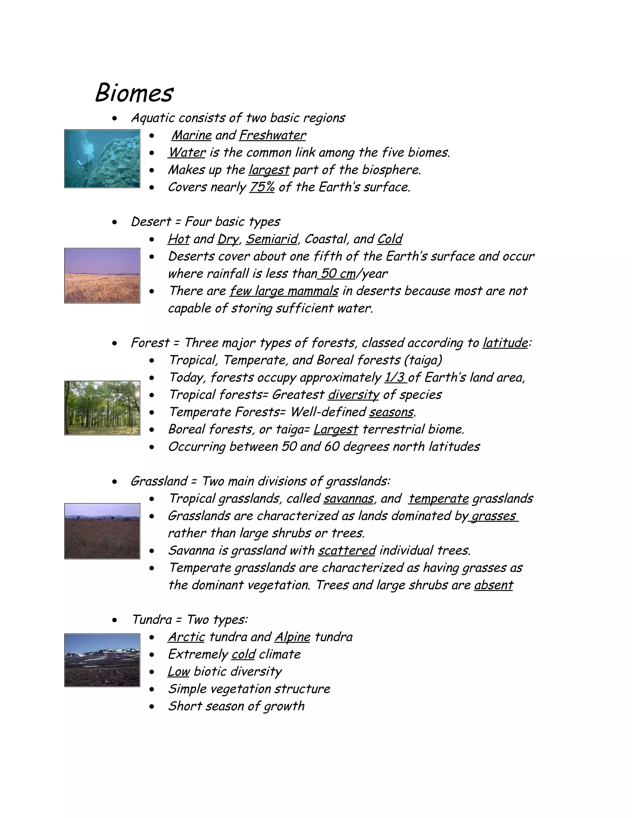The document describes the major biomes of Earth: aquatic, desert, forest, grassland, and tundra. It also covers atmospheric concepts like air masses, fronts, humidity, dew point, rainbows, thunderstorms, lightning, tornadoes, and tropical cyclones that influence weather and climate.