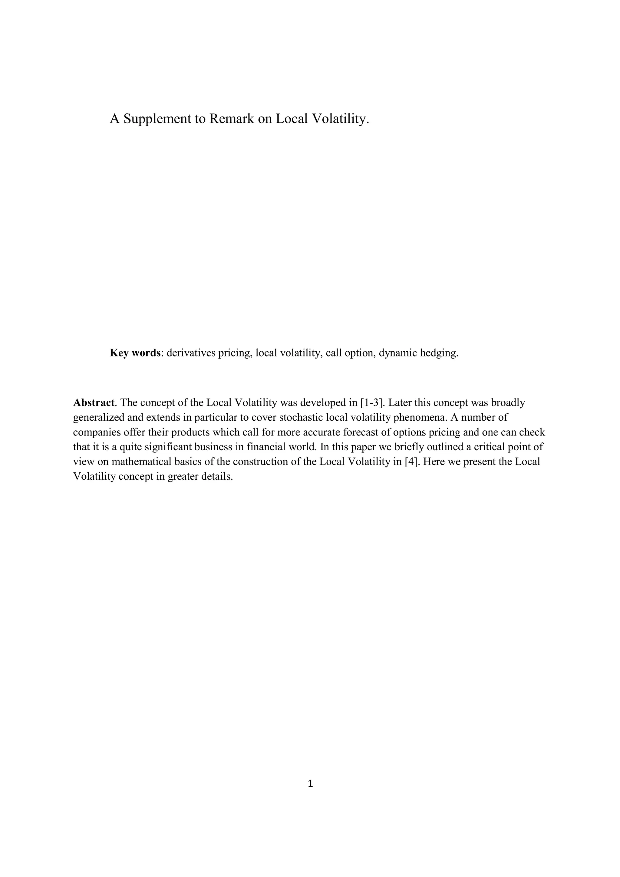 This document provides a summary and critique of the local volatility model. It begins by briefly recalling the construction of the local volatility concept, which aims to find an implied volatility function that matches option prices. However, the document argues that the local volatility model makes an error by replacing the real stock process with an auxiliary process, as they are defined on different coordinate spaces. While the goal of eliminating discrepancies between real and implied volatility is reasonable, the implementation of the local volatility concept ignores important initial conditions. Overall, the document presents both the theoretical basis of local volatility and a critical viewpoint of its mathematical derivation.