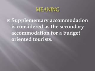 This document discusses supplementary accommodations, which provide affordable lodging options for budget travelers. It outlines several types of supplementary accommodations, including motels, youth hostels, camping sites, pensions, bed and breakfast establishments, and tourist holiday villages. These accommodations have grown in popularity in recent years as they help meet the needs of middle-income travelers seeking affordable places to stay. Supplementary accommodations play an important role in tourism by providing accommodation choices and helping the industry cope with seasonal demand fluctuations.