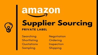 The document discusses supplier sourcing for Amazon. It outlines the process of selecting suppliers through various methods like the internet, trade shows, and product sourcing agencies. It defines common terms in international trade like MOQ, EXW, FOB, and DDP. It provides guidance on evaluating suppliers by checking trade assurances, asking about MOQs and pricing, requesting samples, and creating a supplier template. The document advises negotiating with potential suppliers and selecting the best option based on criteria before finalizing terms of payment and creating a shipping plan.
