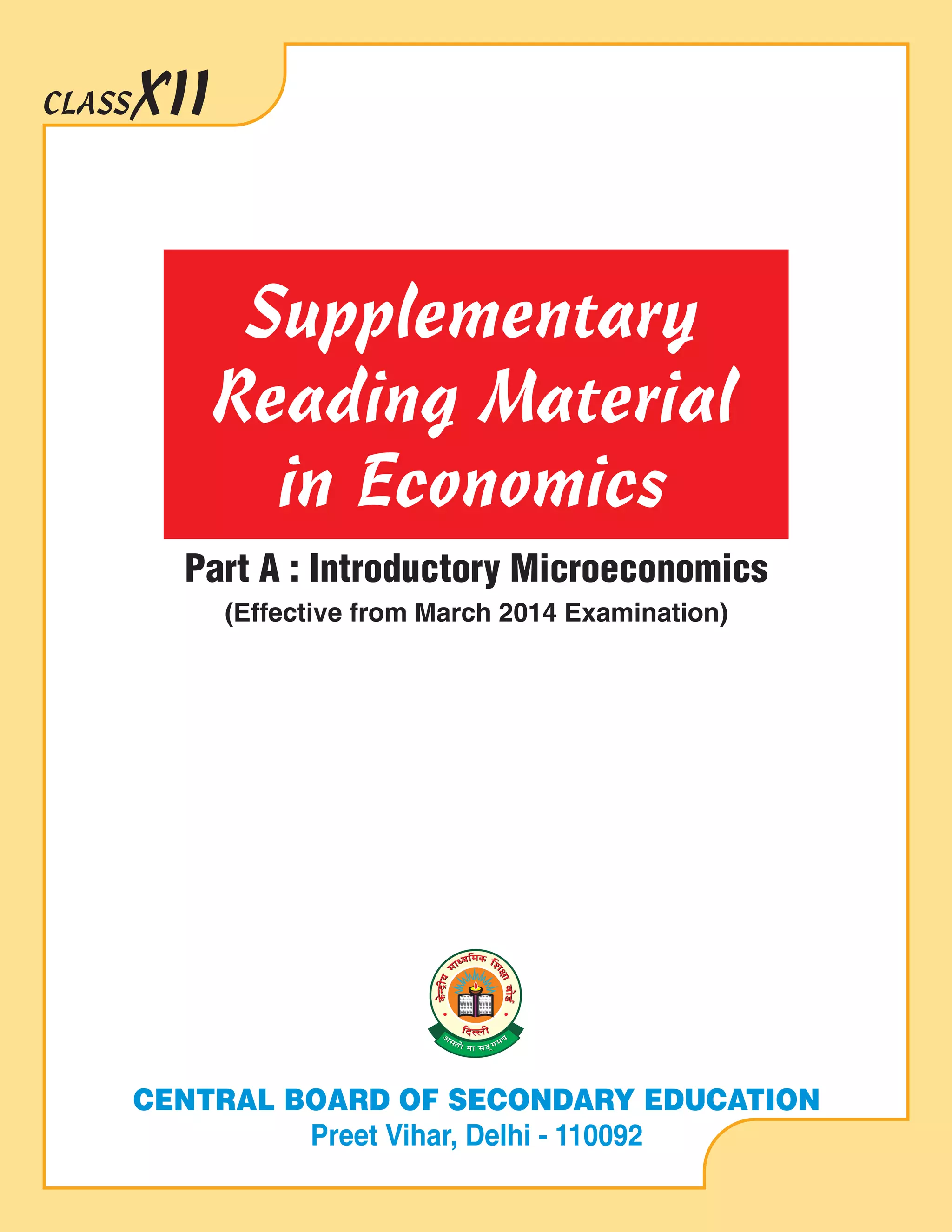 This document provides supplementary reading material for Class XII economics students from the Central Board of Secondary Education in Delhi. It contains introductory microeconomics content that will be covered in exams starting in March 2014. The material includes 20 pages of unfiled notes on microeconomics topics.