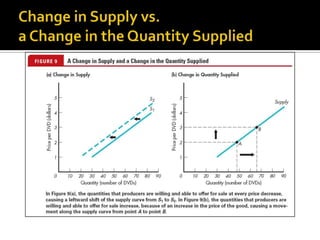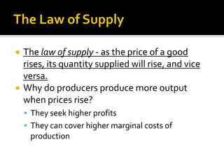 The document discusses the law of supply and factors that cause the supply curve to shift. It explains that the law of supply states that quantity supplied rises with price, as higher prices increase producer profits and allow firms to cover higher costs. It then provides examples of factors that can cause the supply curve to shift left or right, such as changes in input costs, technology, taxes, subsidies, and expectations about future prices. Government regulations can also impact supply.