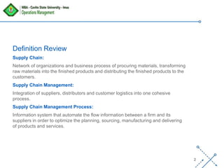 The document discusses supply chain management, emphasizing the integration of suppliers, distributors, and customers to optimize processes from procurement to delivery. Key areas covered include supplier management, procurement versus purchasing, logistics, and the importance of strong relationships with suppliers in a competitive global market. The document outlines effective strategies for managing costs and improving supplier relationships to enhance overall supply chain efficiency.