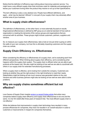 (1) Supply chain efficiency focuses on internal processes and minimizing costs, while effectiveness considers external impacts on customers, stakeholders, and the supply chain as a whole. (2) A supply chain can be efficient but not effective if it optimizes internal functions at the expense of external needs. (3) Boeing's outsourcing strategy for the 787 Dreamliner improved efficiency but hurt effectiveness by causing major delays and cost overruns that negatively impacted customers.