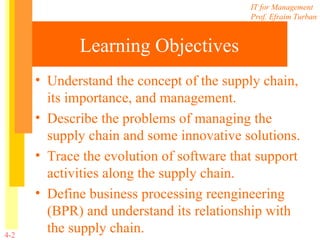 This document discusses supply chain management and business process engineering. It defines key terms like supply chain, enterprise resource planning (ERP), and business process reengineering (BPR). It also provides examples of how Dell and SAP implemented supply chain management and ERP systems to improve operations.