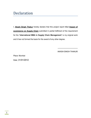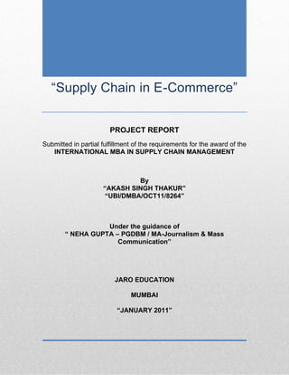 The document is a project report submitted by Akash Singh Thakur for an MBA program. It discusses supply chain management in e-commerce by analyzing the operations of eMart Solutions, an Indian e-commerce company. The report provides an overview of eMart's marketing, human resources, operations, finances, and SWOT analysis. It also examines the supply chain processes involved in procuring and distributing products through e-commerce.