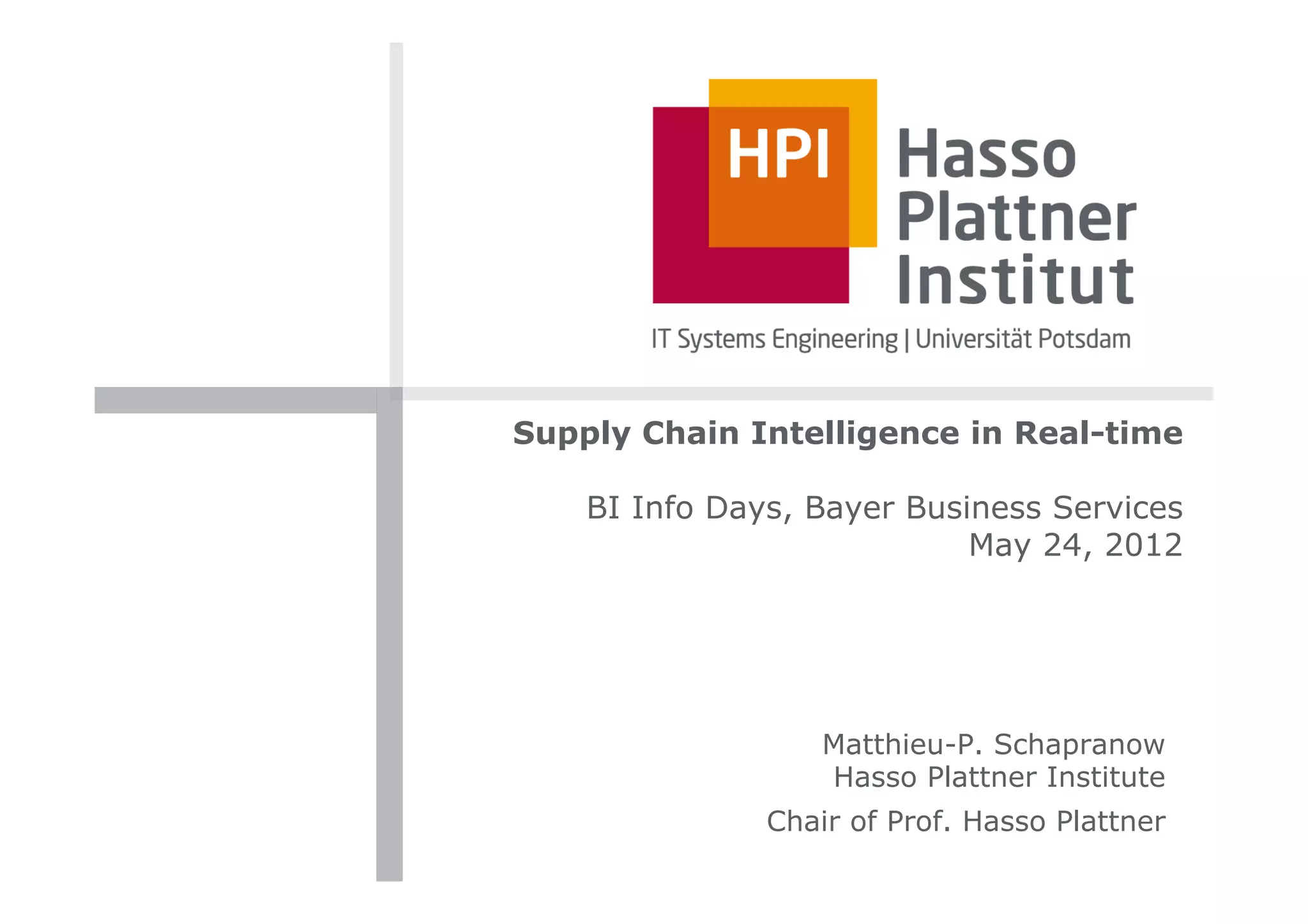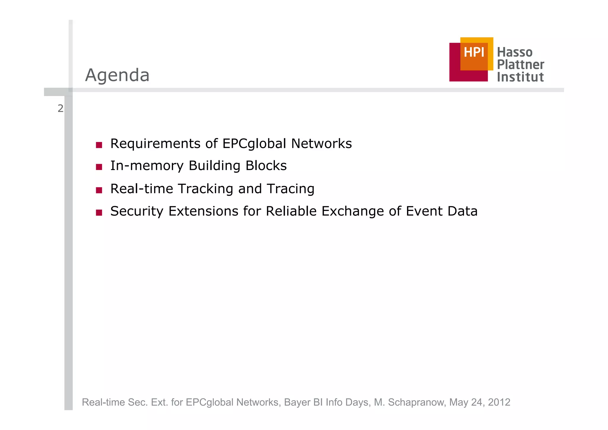 This document discusses supply chain intelligence and security extensions for real-time tracking in pharmaceutical supply chains. It addresses the problems of increasing counterfeiting and the need for fine-grained tracking and security. The presentation proposes an in-memory event processing and discovery service to enable real-time tracking, as well as history-based access control and a trust relationship server to continuously control access to event data while maintaining security, integrity and privacy.