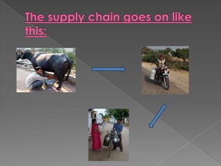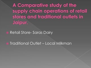 The document describes the supply chain of a dairy cooperative society in Jaipur, India. It discusses the procurement of raw materials from farmers, processing at the dairy plant, distribution through distributors to retailers, and sales to customers. It also compares the organized supply chain system used by the cooperative to the traditional unorganized local milkman system, noting differences in structure, costs, storage, demand forecasting, and information flow. Suggestions are provided for both systems to improve operations.