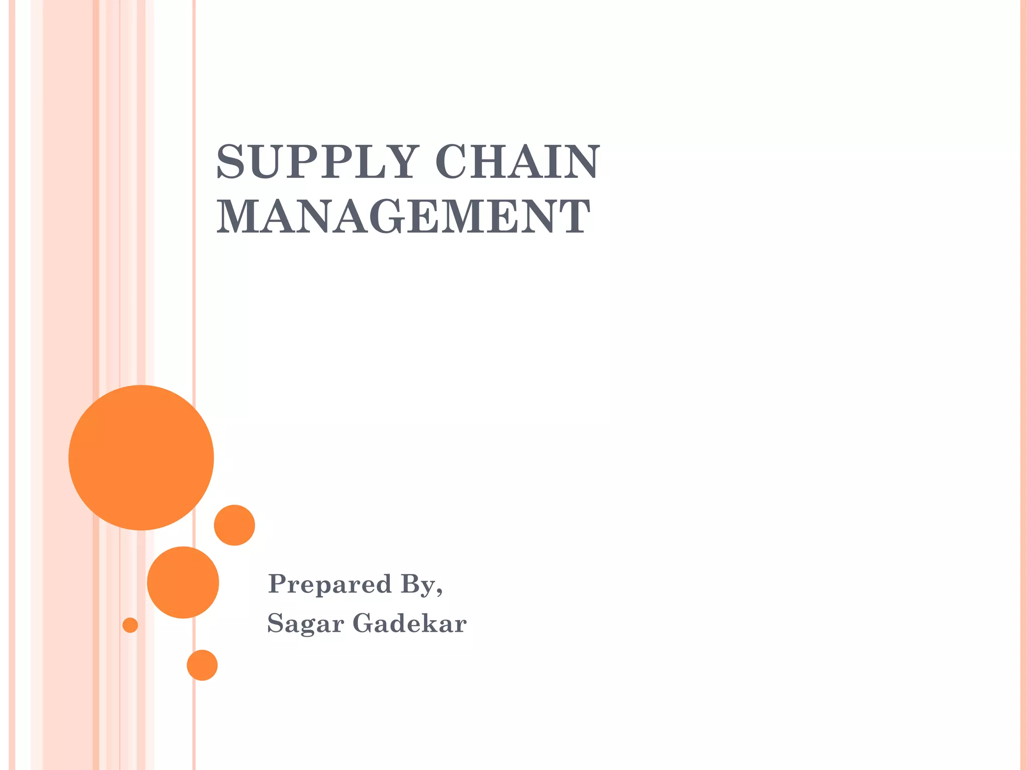 The document discusses supply chain management. It defines supply chain management as the integration of business processes from original suppliers to end users to add value for customers. A supply chain is a network of facilities that procures materials, transforms them into products, and distributes the products to customers. The essential features of supply chain management include integrated behavior across stakeholders, mutually sharing information and risks/rewards, cooperation, focusing on serving customers, integrating processes, and building long-term relationships. The objectives, components, factors influencing, and functions of supply chain management at the strategic, tactical, and operational levels are described.
