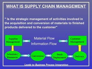 Supply chain management involves coordinating activities from sourcing raw materials to delivering finished products to customers. It aims to reduce costs and improve responsiveness through strategic management of material and information flows. Key aspects of supply chain management include supply chain design, planning, procurement, manufacturing, and customer relationship management. Coordinating these activities can help align forecasting, optimize inventory levels, and enhance collaboration with suppliers and customers. The goal is to efficiently satisfy market demand through an integrated approach.