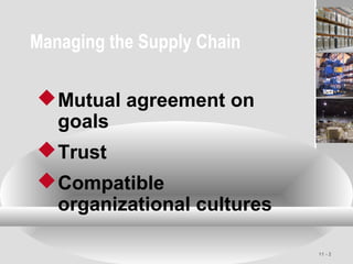 This document discusses key concepts in supply chain management including the importance of mutual goals, trust, and compatible cultures between organizations in the supply chain. It also discusses challenges like local optimization, incentives that prioritize short-term gains over efficiency, and the bullwhip effect. Opportunities in integrated supply chains are larger including accurate demand information, reduced lot sizes, and collaborative planning. E-procurement, vendor selection, logistics management, distribution systems, third-party logistics, and the tradeoffs of shipping costs and inventory holding costs are also summarized.