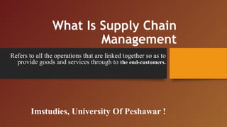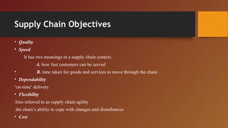 This document discusses supply chain management. It defines supply chain management as all operations linked to provide goods and services to end customers. The objectives of supply chain management are listed as quality, speed, dependability, flexibility and cost. The key activities of supply chain management are purchasing, physical distribution management, transportation, storage, warehousing, order processing and communication. The document also discusses relationships in supply chains between businesses and customers, and types of partnerships. It outlines approaches to improving supply chain performance, including the Supply Chain Operations Reference (SCOR) model of business process modeling, benchmarking and best practices analysis.