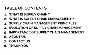 The document provides an overview of supply chain management (SCM), defining the supply chain and its importance in coordinating business functions. It outlines seven key principles of SCM and describes its evolution through different stages. The document also promotes services offered by EssayCorp for students seeking assistance with supply chain management assignments.