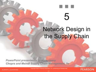 This document discusses network design in supply chains. It begins by outlining the key network design decisions, including facility role, location, capacity allocation, and market/supply allocation. It then discusses factors that influence these decisions, such as strategic, technological, economic, political, infrastructure, and competitive factors. The document presents a framework for network design decisions involving defining strategy, regional configuration, site selection, and location choices. It concludes by describing models that can be used for facility location and capacity allocation decisions, including a capacitated plant location model and gravity location model.
