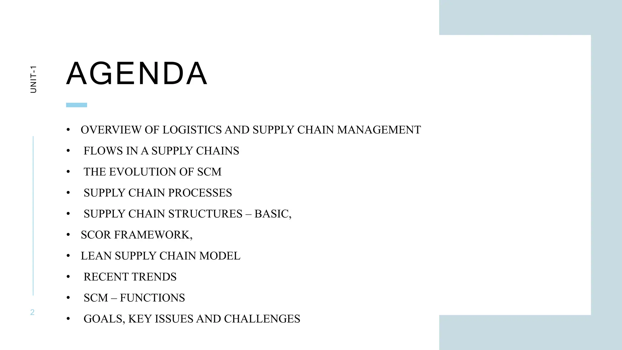 This document provides an overview and agenda for a course on supply chain management. It discusses key topics that will be covered, including logistics and SCM concepts, flows within supply chains, the evolution of SCM, supply chain processes and structures, frameworks like SCOR, trends like lean supply chains, SCM functions and goals. It also notes that managing supply chains is challenging due to factors like geographically dispersed networks, conflicting objectives across stages, uncertainties and risks, and information distortion.