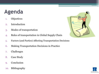 The document discusses different modes of transportation used in global supply chains, including road, rail, air, water, and pipelines. It describes the advantages and disadvantages of each mode and factors to consider when selecting a transportation method. These include the type of goods being shipped, delivery timelines, costs, and origin and destination locations. The document also examines transportation's role in supply chains and challenges around infrastructure, environmental issues, and changing demand patterns.
