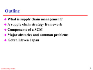 The document discusses supply chain management strategies. It explains that companies must match their supply chain capabilities with customer demands and implied uncertainty. A responsive supply chain designed for uncertain demand comes at a higher cost than an efficient chain for certain demand. The strategic fit between supply chain and competitive strategy over a product lifecycle is also discussed.