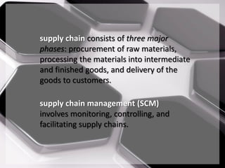 The document discusses supply chain management and supply chain systems. It describes the key phases of a supply chain as procurement, processing, and delivery. Supply chain management involves monitoring, controlling, and facilitating supply chains, while supply chain systems are information technologies that support supply chain management. The document also discusses options for businesses setting up websites, including installing their own web servers or using a web hosting service.