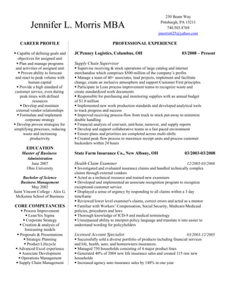 Jennifer Morris has over 10 years of experience in supply chain management and operations leadership. She currently serves as a Supply Chain Supervisor at JCPenney, where she supervises receiving and stock operations valued at $500 million annually. Previously, she held roles in claims examination and insurance sales. Morris has a proven track record of improving processes, reducing waste, and increasing productivity through tools like Lean Six Sigma. She also has experience developing strategies, managing teams, and fostering collaborative work environments.