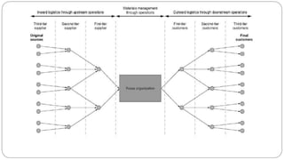 This document provides an overview of supply chain management concepts. It defines key terms like logistics and supply chain management. It then discusses various components of a supply chain like facilities, inventory, transportation, and information and how decisions around these components can impact efficiency and responsiveness. The document also examines sourcing, pricing and supply chain collaboration strategies and how they relate to the competitive strategy.