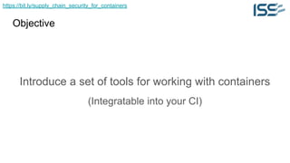 The document discusses supply chain security for containerized workloads, emphasizing the importance of integrating various tools into CI/CD pipelines to enhance security. It covers topics such as the rise of container adoption, differences between containers and virtual machines, and the significance of managing dependencies and images safely within container environments. The document also introduces tools and practices for scanning vulnerabilities, signing images, and ensuring best practices in infrastructure as code.
