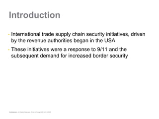 The document discusses international trade supply chain security initiatives initiated post-9/11, focusing on the framework for securing trade that includes AEO certification to enhance security and facilitate custom processes. It highlights the objectives of the European Union's customs security program and the benefits of AEO certification for businesses, emphasizing its role in combating terrorism and streamlining trade. Key debate topics include the implications of AEO certification for various stakeholders within the supply chain and the need for global consistency in its application.