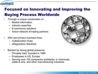 Supply Chain Connect provides collaboration hub and eNegotiation solutions to help companies optimize their supply chain processes. Their collaboration hubs allow companies to automate transactions like ordering and inventory visibility with suppliers. Their eNegotiation solutions facilitate online bidding to help companies efficiently negotiate contracts. They have experience serving over 100 companies in industries like chemicals, cable, and manufacturing.