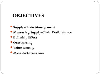 This document discusses key concepts in supply chain management including defining a supply chain and supply chain management. It discusses measuring supply chain performance using metrics like inventory turnover. The document also covers concepts like the bullwhip effect, Hau Lee's supply chain uncertainty framework, reasons for outsourcing, value density, and mass customization. Formulas are provided for calculating inventory turnover and weeks of supply. An example is given to demonstrate calculating inventory turnover.
