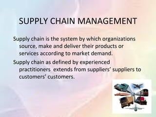 This document discusses supply chain management and compares the supply chains of a traditional retail outlet and Raymond outlet. It notes that supply chain includes material, information, and financial flows. It provides details on Raymond Group, a large fabric and fashion retailer, and describes differences in the suppliers, transportation, warehouses, ordering processes, demand forecasting, and inventory management between the traditional and Raymond retail outlets. The key differences are in the number of suppliers, transportation modes, order quantities and frequencies, expense responsibility, and flow of information.