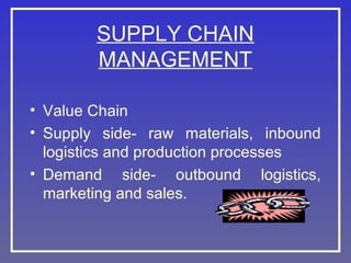 The document provides an overview of supply chain management. It defines supply chain management as the strategic management of activities involved in acquiring raw materials and converting them into finished products delivered to customers. It describes key aspects of effective supply chains such as integrating business processes, forecasting collaboratively with all supply chain partners, customizing logistics networks based on customer service needs, and differentiating products close to customers. It also discusses challenges like the bullwhip effect and strategies used by companies like Dell, Li & Fung, and Italian clothing manufacturers to implement efficient supply chain management.