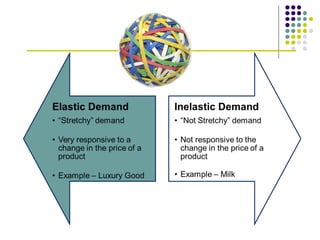 The document discusses supply and demand. It defines demand as the quantity consumers are willing and able to purchase at different prices. The law of demand states that quantity demanded increases when price decreases. Demand can shift due to factors like income, tastes, or prices of substitutes. Supply is defined as the quantity producers are willing to supply at different prices. The law of supply states that quantity supplied increases when price increases. Supply can shift due to costs of production, number of producers, or technology. Equilibrium occurs where quantity supplied equals quantity demanded. Disequilibrium results in shortages or surpluses which push prices toward the equilibrium level.