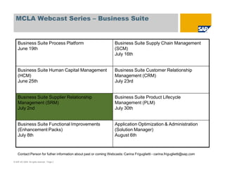 The document presents an overview of SAP's Business Suite 7.0 and its procurement excellence features, detailing the capabilities of Supplier Relationship Management (SRM) and integration with other business processes. It highlights the advantages of enhancement packages that enable modular upgrades, increased compliance, and improvements in procurement efficiency across industries. Additionally, information about upcoming webcasts related to various components of Business Suite is also provided.