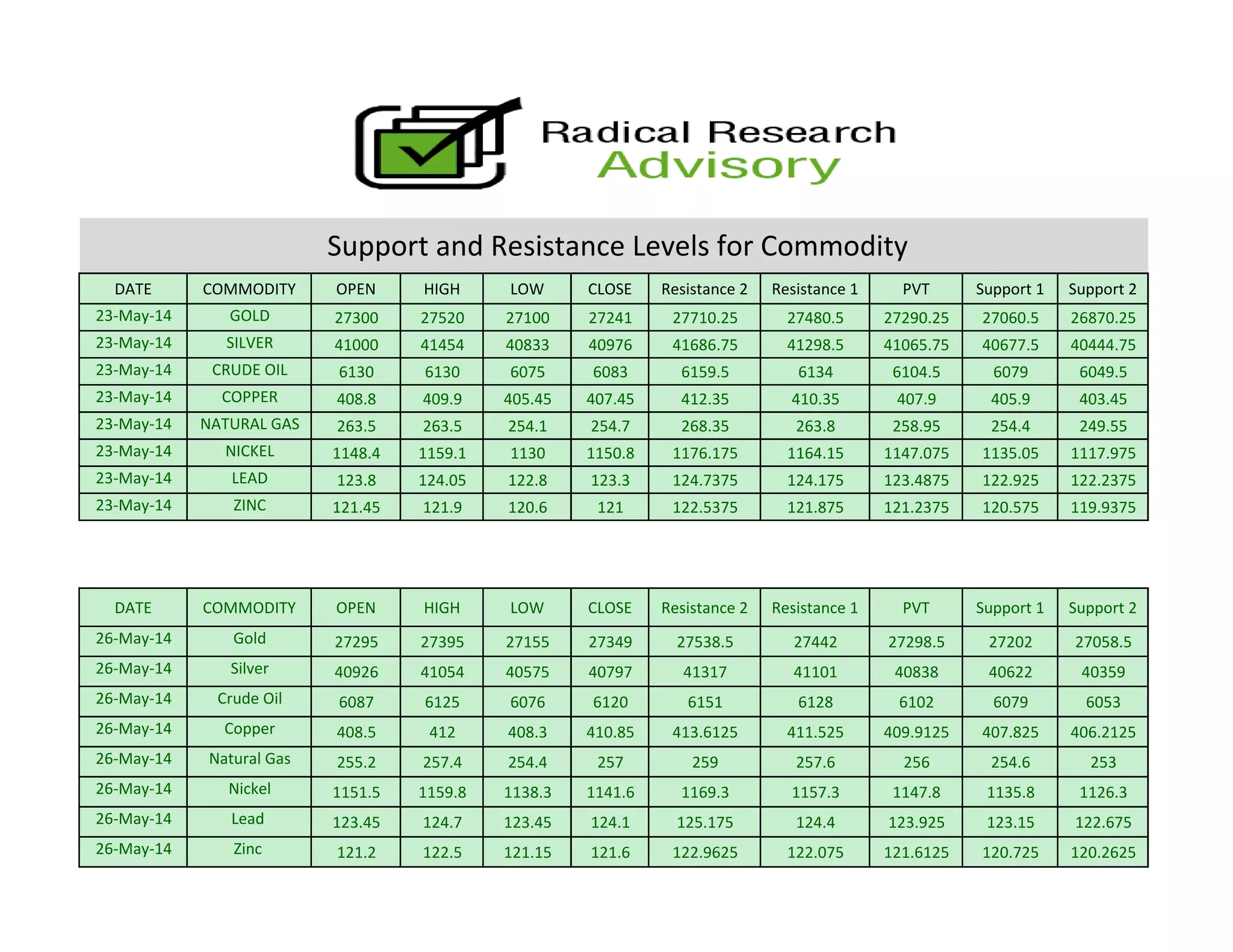 The document reports the opening, high, low, and closing prices for various commodities on May 23rd and 26th along with support and resistance levels. It includes data on gold, silver, crude oil, copper, natural gas, nickel, lead, and zinc prices over the two dates. Support and resistance levels are given which can indicate where prices may stop rising or falling.