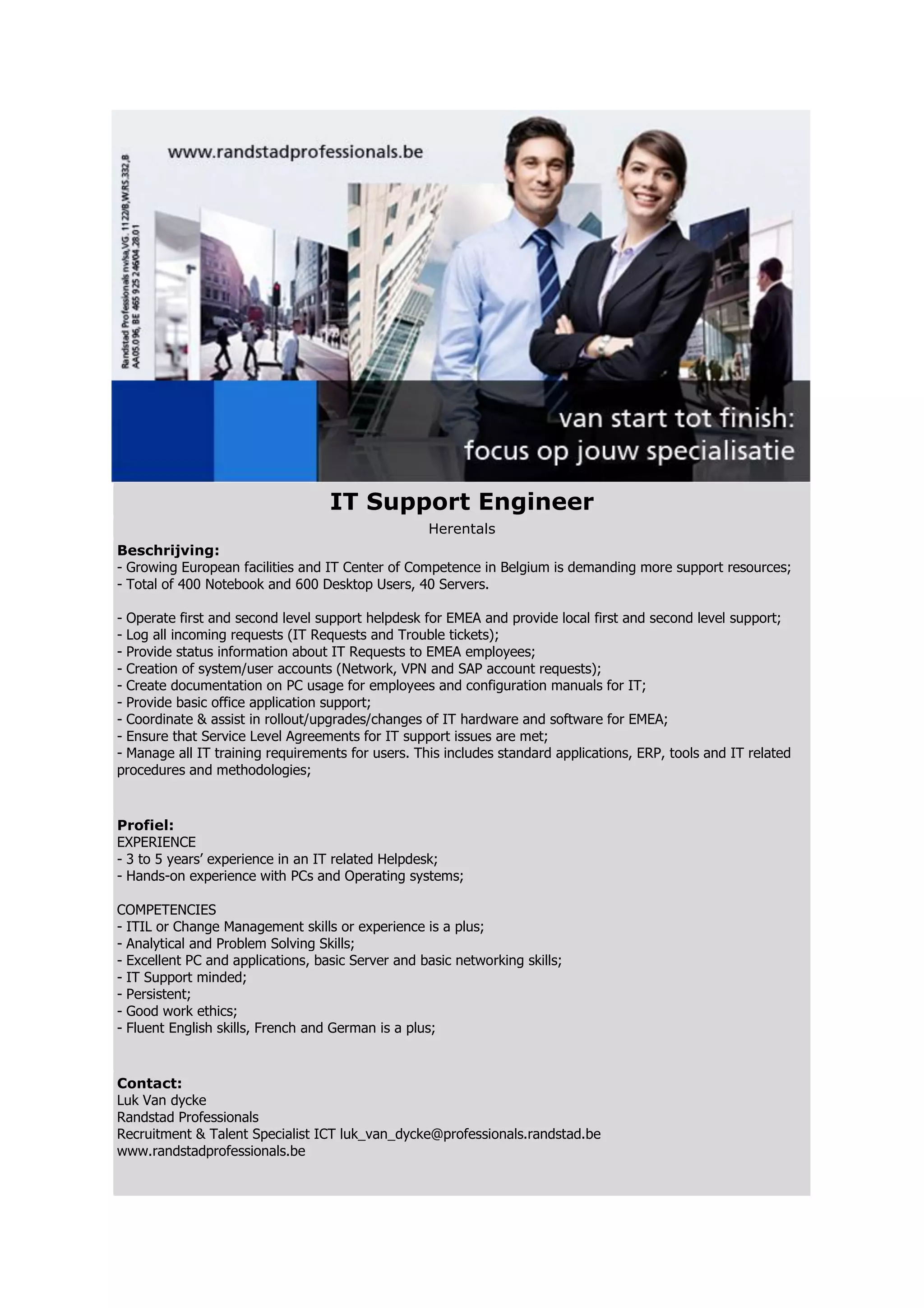 This job posting is for an IT Support Engineer position located in Herentals, Belgium. The role involves providing first and second level technical support to 400 notebook and 600 desktop users across 40 servers for EMEA facilities. Responsibilities include operating the helpdesk, tracking requests and issues, creating user accounts, documenting IT procedures, coordinating upgrades, and ensuring service level agreements are met. The ideal candidate has 3-5 years of helpdesk experience, is proficient with PCs, operating systems, and basic server and networking skills. Strong analytical and problem-solving abilities are required along with good communication skills.